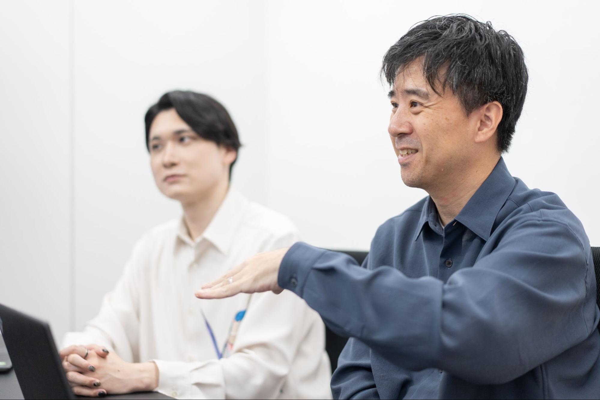 Tatsuya 出会った当初は穏やかで温和な方だなという印象でした。実際に会議でご一緒して、その人柄がチームの雰囲気を良くしていると実感しました。特に若手や中途入社のメンバーが話しやすいように場の雰囲気を和ませる力は、素晴らしいと思います。